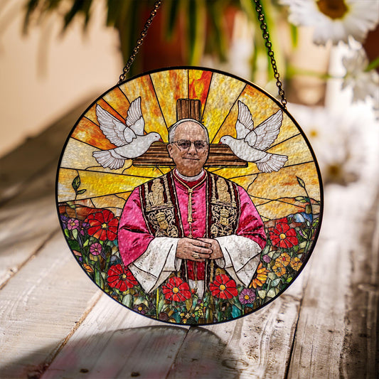 Catholic Glass Suncatcher with Pope and Doves, Stained Glass Style Window Hanging, Religious Christian Gift with Cross and Floral Design (Sun-119)