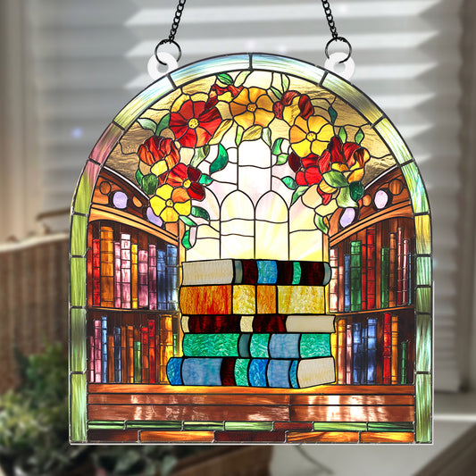 Bookshelf Stained Hanging Suncatcher, Book Stack Window Hanging, Gift for Bookworms and Teachers, Handmade Hanging Book Art (H-Sun-26)