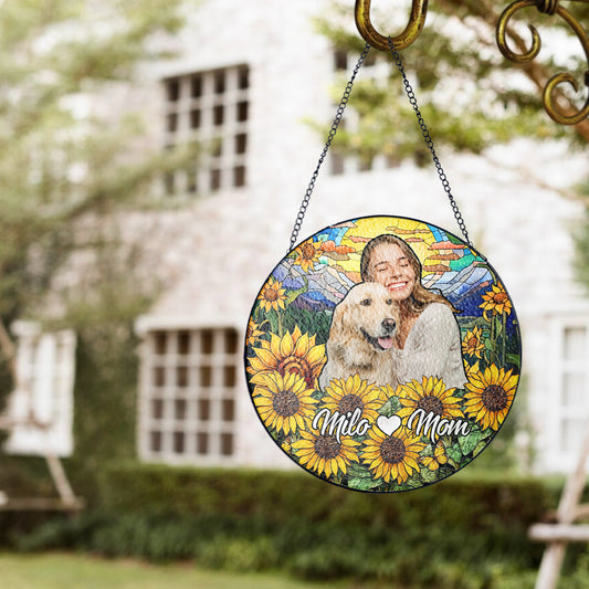 Custom Glass Suncatcher Featuring Pet and Owner – A Personalized Sunlit Tribute for Remembering a Beloved Furry Companion (Sun-68)