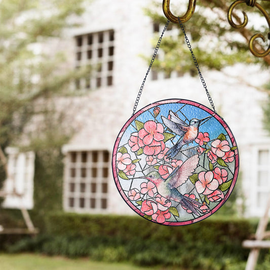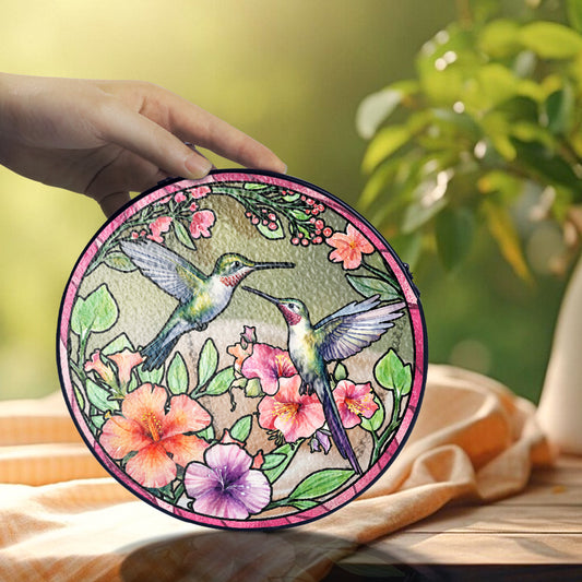 Custom Glass Suncatcher with Hummingbird Couple – A Romantic Window Hanging for Bird and Nature Lovers (Sun-30)