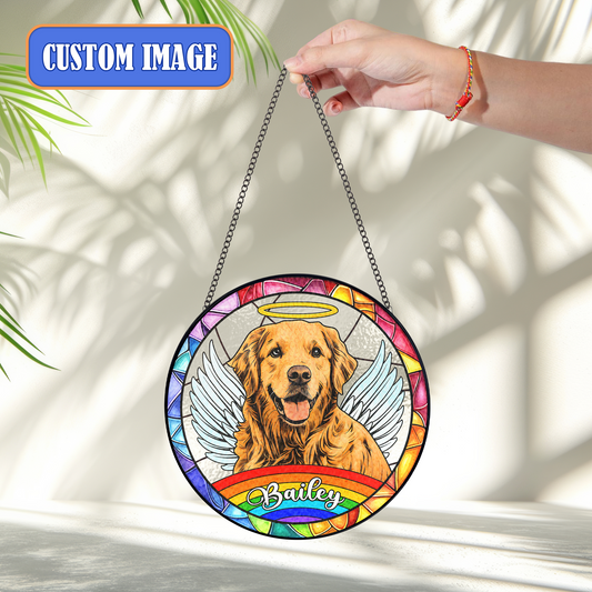 Custom Rainbow Bridge Dog Suncatcher, Stained Glass Style Window Decor with Angel Dog, Wings, and Halo (Sun-97)
