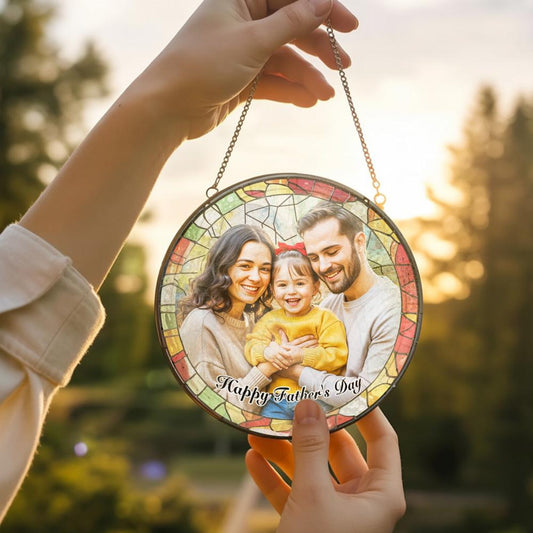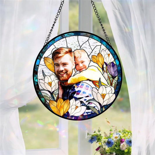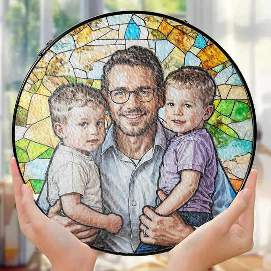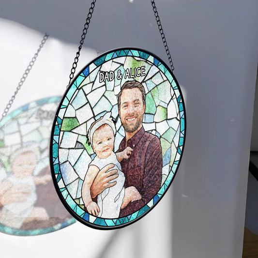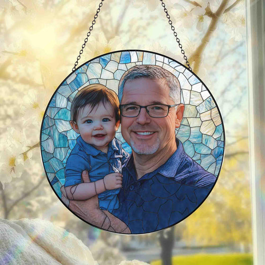 Custom Father's Day Gift, Personalized Photo Glass Suncatcher, Stained Glass Portrait, Family Picture Window Hanging, Gift for Grandpa Dad Papa (Sun-158)