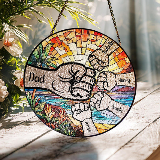 Personalized Fist Bump Dad Stained Glass Suncatcher, Father's Day Gift, Custom Dad With Kids Names, Family Name Suncatcher Window Hanging (Sun-153)