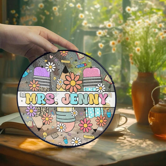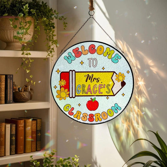 Personalized Teacher Stained Glass Suncatcher, Custom Name Sign Rainbow Pencil Bright, Classroom Decor, Back To School, Gift For Her (Sun-160)