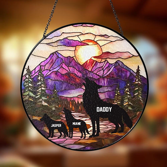 Personalized Fathers Day Wolf Stained Glass Suncatcher, Dad Gift From Kid, Fathers Day Gift, Wolf Dad Suncatcher Window Hanging, Family Gift (Sun-155)