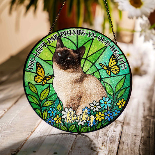 Personalized Pet Memorial Glass Suncatcher, Pet Loss Gift with Custom Name & Quote, "You Left Paw Prints In Our Hearts" Window Hanging (Sun-122)