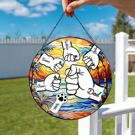 Custom Fist Bump Dad Glass Suncatcher, Custom Dad With Kids Names, Family Name Glass Suncatcher Window Hanging, Father's Day Gift (Sun-128)