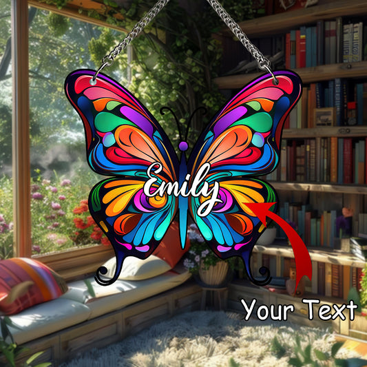 Personalized Butterfly Glass Suncatcher – Custom Name Window Hanging – Stained Glass Style Memorial or Gift for Her (Sun-91)