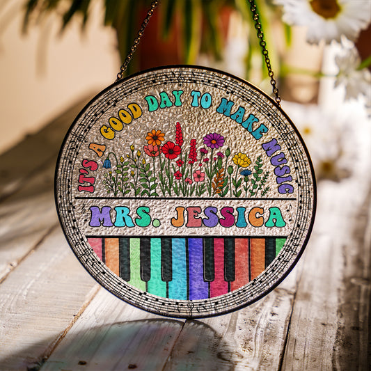 Personalized Music Teacher Glass Suncatcher – Custom Name Piano Design with Flowers – Gift for Music Instructor or Choir Teacher (Sun-83)