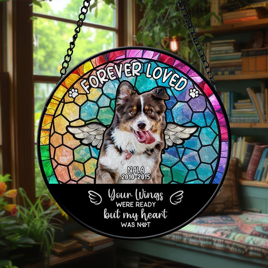 Personalized Pet Memorial Glass Suncatcher – Dog Loss Gift with Name and Dates – ‘Your Wings Were Ready’ Rainbow Window Hanging (Sun-89)