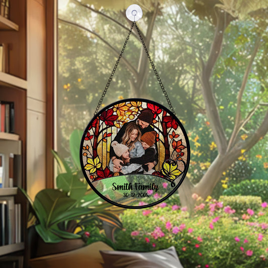 Personalized Family Photo Glass Suncatcher – Custom Stained Glass Window Hanging with Name and Date – Fall Tree Theme Gift for Family (Sun-85)