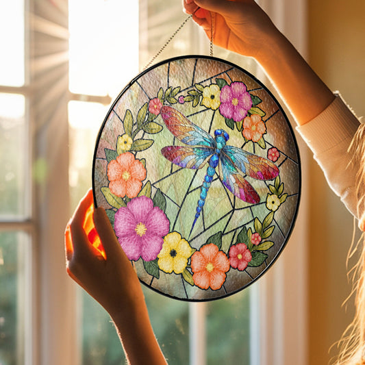 Floral Dragonfly Glass Suncatcher – Multicolor Stained Glass Art for Home Window Decor (Sun-63)