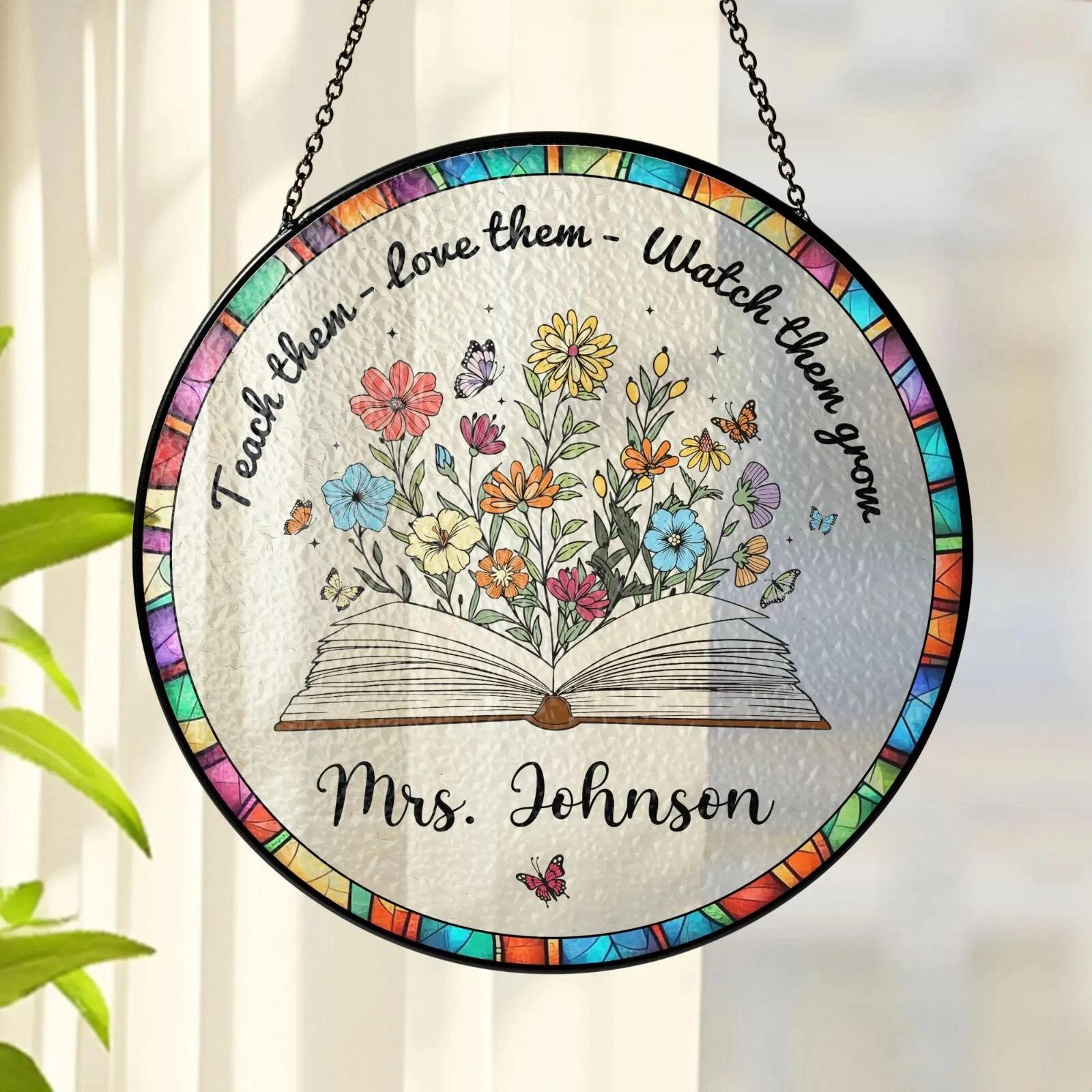 Custom Book And Flower Teacher Stained Glass Suncatcher, Window Hanging, Teacher Appreciation Gift, Back To School, Classroom Decor (Sun-162)