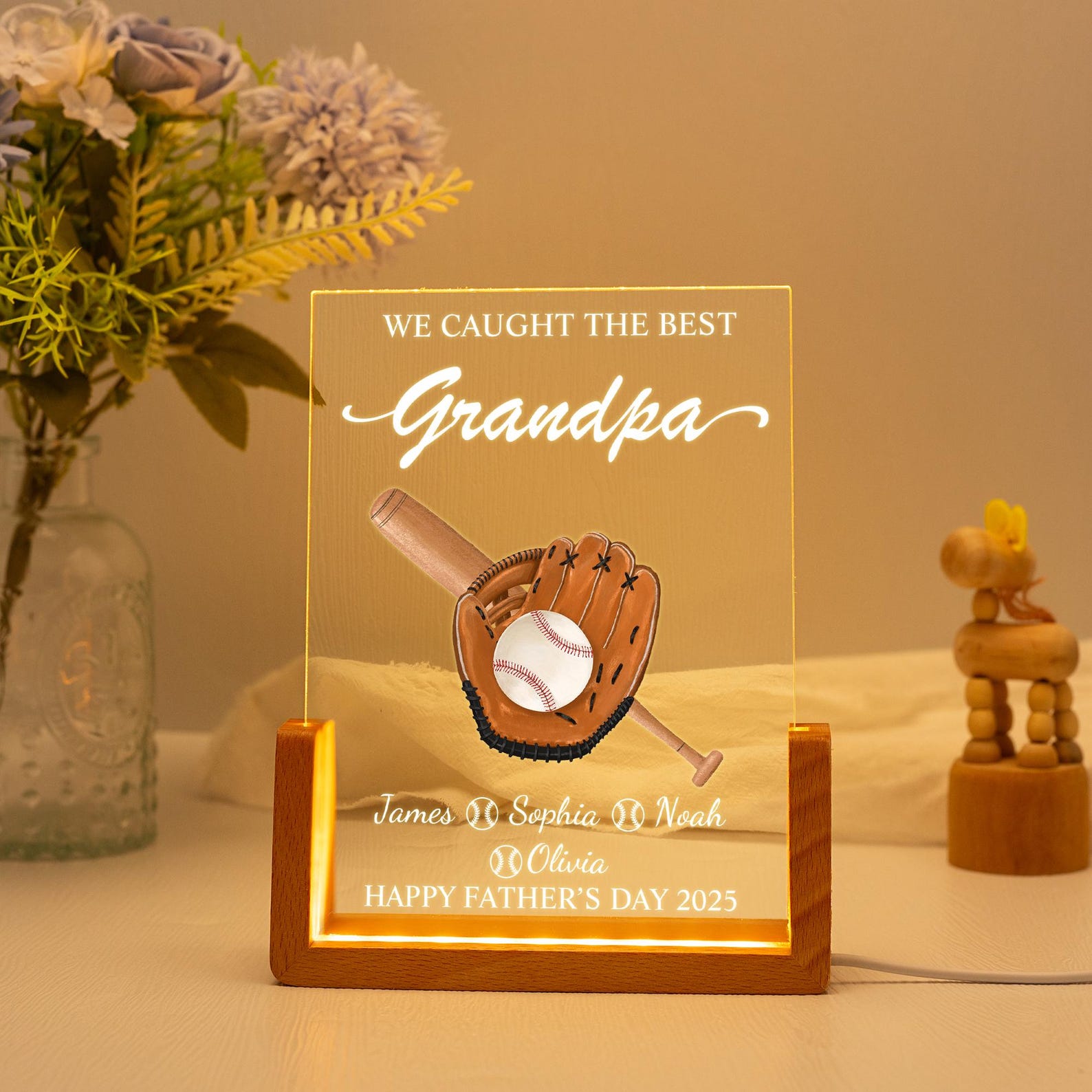 Celebrate the MVP in your life with this Personalized Baseball Night Light, featuring the heartfelt phrase “We Caught the Best Dad”. Crafted from durable acrylic and set on a wooden LED base, this one-of-a-kind plaque is the perfect Father’s Day gift for any sports-loving dad or grandpa.